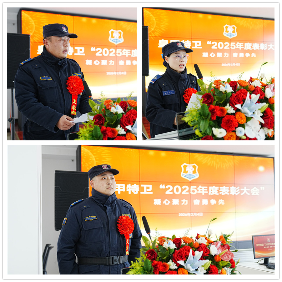 2月4日,皇甲特卫保安服务集团公司召开2025年度总结暨表彰大会。常务副总孙春彦、董事长助理兼副总经理秦超逸、副总经理张捷及各部门、项目负责人、优秀员工代表齐聚,回顾奋斗历程,表彰先进典型,锚定新年目标,吹响再攀高峰的号角。